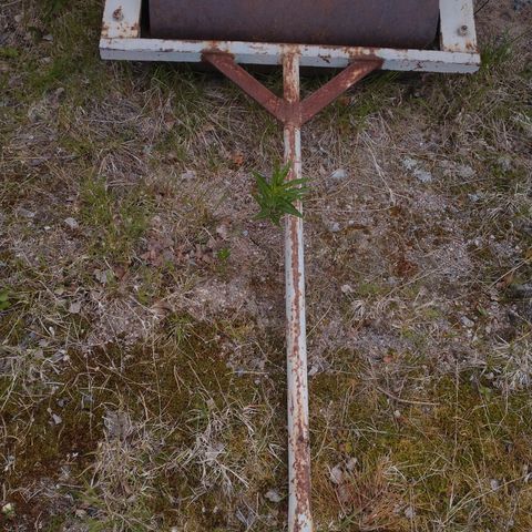 Kyläsepän tekemä nurmikkojyrä. Ei mikään rimpula, voi vetää käsin tai koneella. Aisan poikkitangon saa pois, jolloin saa kiinni vaikka ajettavaan leikkuriin tai mönkijään. Käsinkin tuota hyvin vetää. Painoa voi säätää veden määrällä.