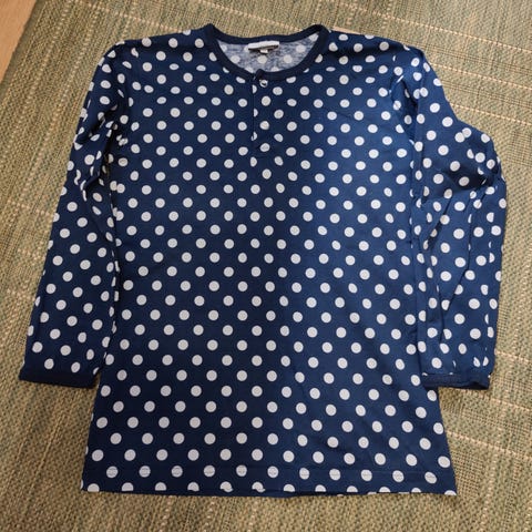 Marc O'polo lyhythihainen paita ohutta oliivin väristä kangasta, jossa vaaleita pieniä palloja. Hieman alaspäin levenevä malli. Koko 128 cm. Hinta 6e.