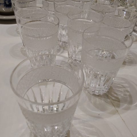 6 kpl kauniita, kristallisia aromilaseja ja karahvi, kork. 27 cm.