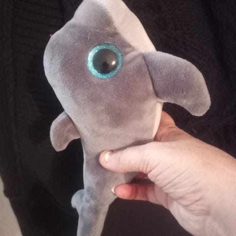 Muovinen, erittäin hyväkuntoinen delfiinilelu. Kun sitä puristaa tulee vinkuva ääni. Pituutta sillä on n. 14 cm. Sen voi hakea tai voin lähettää.