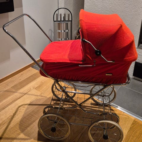 Brio nukenrattaat 70-luvulta, hyväkuntoiset, velour-päällinen irroitettavissa ja pestävissä. Kokoontaitettavat.