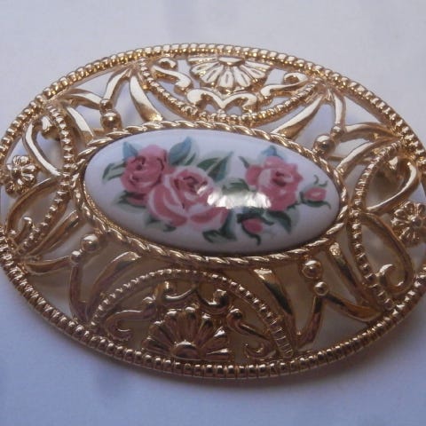 Kaunis vanha kellertävä lasitettu koru, jotakin massaa tai keramiikkaa. Koko 2,7 x 2,5 cm. Neulakiinnitys. Takana kahdessa kulmassa pientä vikaa, muuten ehjä ja siisti vanha koru. Postitus tai nouto.