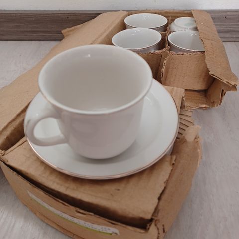 Ruusukuvioiset ja kultareunaiset kahvikupit, asetit ja pullalautaset. Käytetyt, mutta virheettömät. Lautaset nelikulmaiset ja kulmista pyöristetyt. Koko setti 15 euroa.