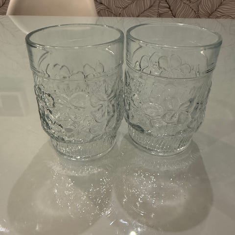 Mahtava erä eri värisiä vanhoja Viola juustolaseja, ilmeisesti Nuutajärven tuotantoa. Lasien korkeudet vaihtelevat hiukan, pääasiassa 8 cm.