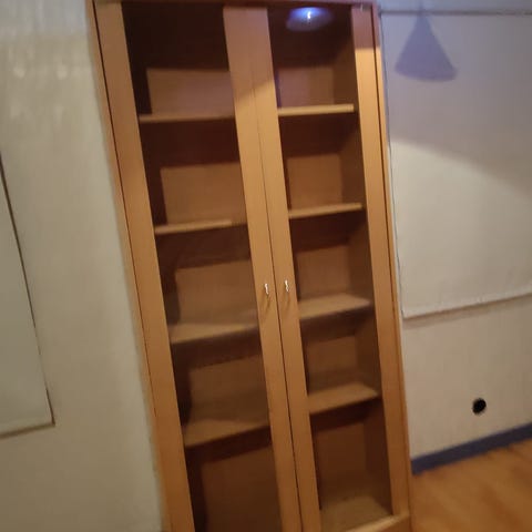 Käsityönä tehty vitriini ja sivuille kuuluvat hyllyt. Väri on harmaa ja pinnalla näkyy puiset kuviot.