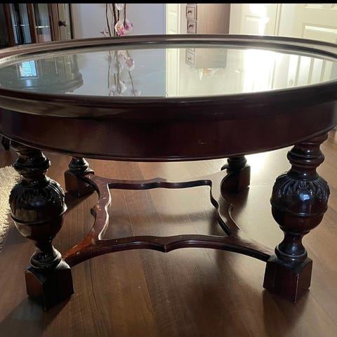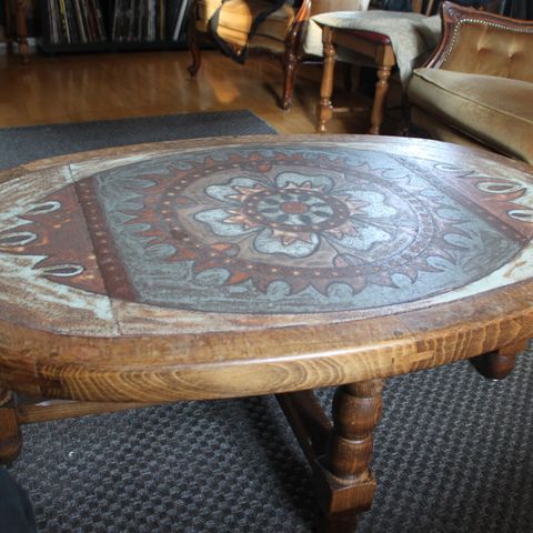 Vähän toisenlainen kokopuu sohvapöytä. Lasikansi puureunuksella nousee ja väliin voi laittaa vaikka pitsiliinan,valokuvia, postimerkkejä yms. Pysyy paikoillaan eikä vaeltele, liina tms. nimittäin. Trendikästä ruskeaa ja pyöreitä muotoja. Sopii hienosti teak kalusteisiin. Halkaisija 110 cm.