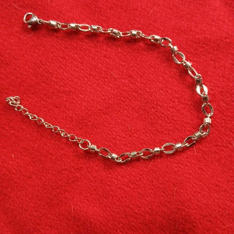 Ihana Infinity-rannekoru, suomeksi Ikuisuus-rannekoru, jossa kultaista metallia ja mustat mokkanauhat. Papukaija-lukkokiinnitys jatkopalalla.