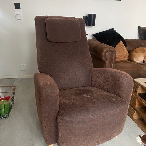 Myydään nojatuoli alkuperäisellä kankaalla, kangas muuten ehjä, mutta etureunoissa pienet nirhaumat. Katso kuva. Tuolissa puiset käsinojat, jossa tiikkiset levikkeet. Jaloissa messinkitupit. Vain nouto.