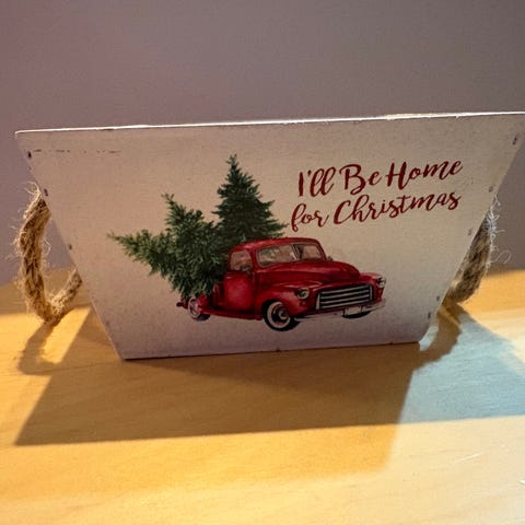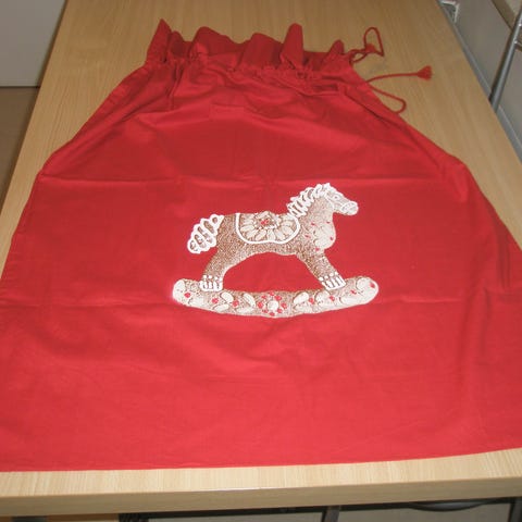 Sisäpuoli punainen ja ulkopuoli vihreä joulupukki- ja rekikuvilla.