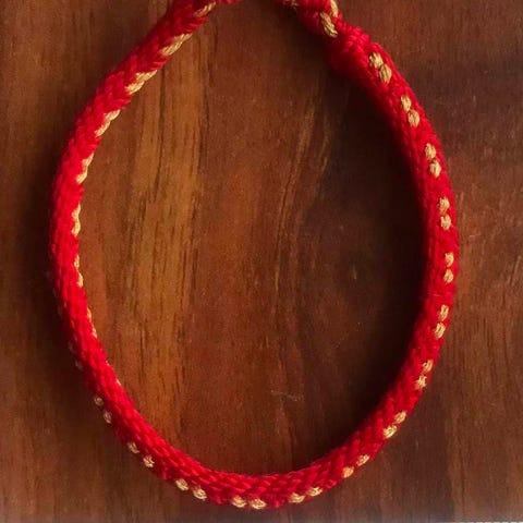 Ihana Infinity-rannekoru, suomeksi Ikuisuus-rannekoru, jossa kultaista metallia ja punaiset mokkanauhat. Papukaija-lukkokiinnitys jatkopalalla.