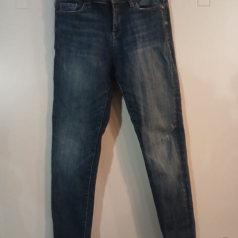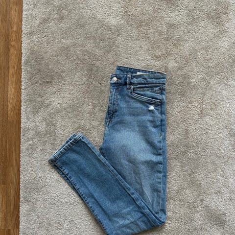 Siistit suoralahkeiset farkut, etutaskun vuoren saumassa pieni reikä (kuva) sekä saman etutaskun alla kulumaraita (kuva).