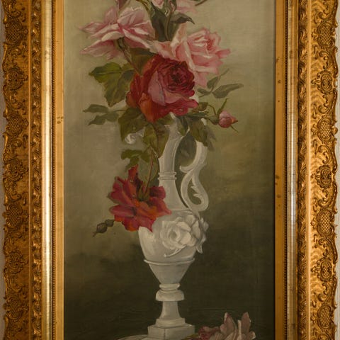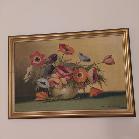 R. Alle'nin Kukka-asetelma vuodelta 1941. Työn korkeus on 35 cm ja leveys 44 cm. Kehys 53 X 62 cm.