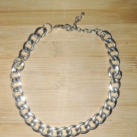 Hopeanvärinen kaulaketju. Pituus 40 cm. Valmistajan leima lukon lenkissä. Ei hopeaa. Ehjä. Postitus tai nouto.