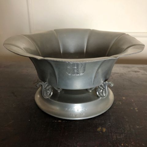 Hieno vanha jalallinen tina astia/ hedelmäkulho. Valmistaja ruotsalainen svenskt tenn. Upeat yksityiskohtaiset kala jalat. Käsinkoristeltu. Leimat pohjassa ja valmistusvuosi D8 eli 1930.Hyvässä kunnossa ikäisekseen.