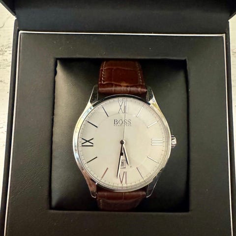 Erinoimaisessa kunnossa Hugo Boss Miesten kello. Vedenpitävä, 5ATM / 50 meters. All stainless steel. Ruskea nahka rannenauha, vähän kulunut mutta huolimatta että menisi rikki. Vaatii akun vaihtoa.