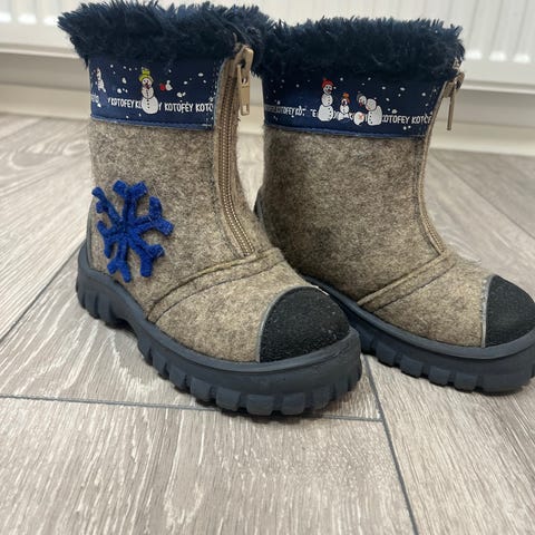 Lasten pj -talvikengät. Kengissä on kosteutta hylkivä kalvo, mutta ne eivät ole täysin vedenpitävät. Päällinen on mokkanahkaa ja kiinnityksenä on tarrat. Vuori on tekoturkista.mukaan lämpimät vaihtopohjalliset.