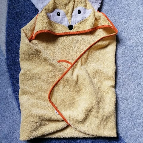 Vaaleansininen vauvan huppupyyhe. Hyväkuntoinen, 1 lapsella käytetty, hajusteettomasti pesty.