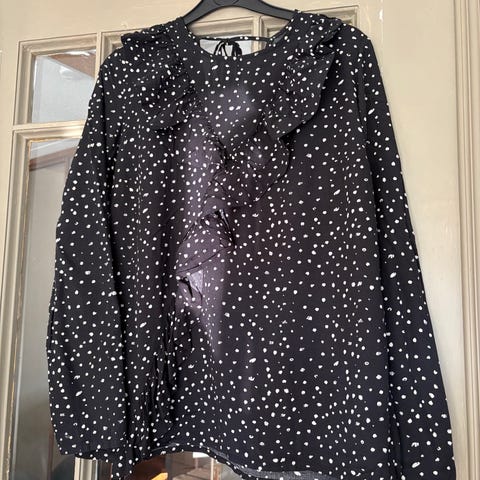 Supersöpö tummansininen kauluspaita, jossa valkoisia, beigejä ja vihreitä pilkkuja. Edessä napit ja tasku. Hihoissa myös napit. Kokolapun mukaan L, mutta sanoisin että S-M koolle kivempi. Itselle hieman liian nafti nykyisin. Kai-kai 50cm ja pituus 65cm. Käytetty vain muutaman kerran. Ihana vilpoinen ja kevyt 100% viskoosimateriaali.