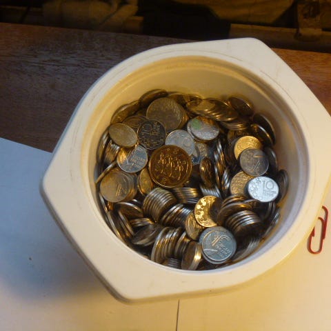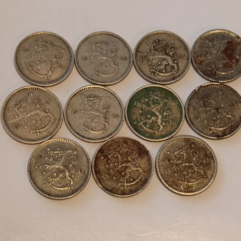 10 pennin kolikoita ehkä 500 grammaa vuoden 2000 vaiheilla aivan ok