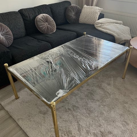 Myydään hieno ja ehjä lasipöytä messinkisillä jaloilla