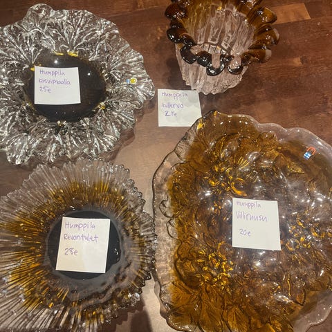 Kuvassa ylempänä olevan tarjoilukulhon halkaisija 260 mm ja korkeus 90 mm. Toisen tarjoiluastian halkaisija 253 mm ja korkeus 90 mm. Kumpaakaan ei ole käytetty. Hinta yhteensä 40 eur/ tarjous