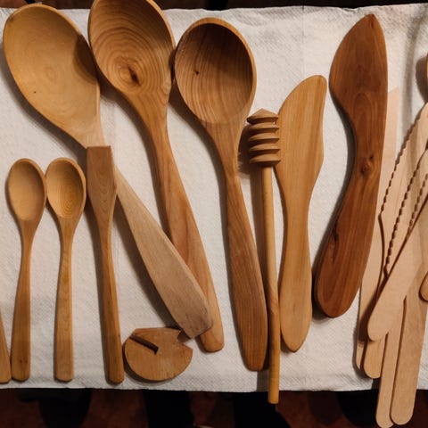 Pihvileikkuulauta ruokailuvälineillä ja luonnonpuukulholla 36cm. 4 kpl