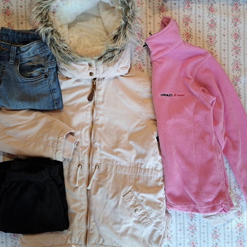 Remu Travelle pinkit kevyttoppahousut, koko 140. Rönttähousut, lahkeensuut rikki, pepussa ja polvissa pehmentymää.