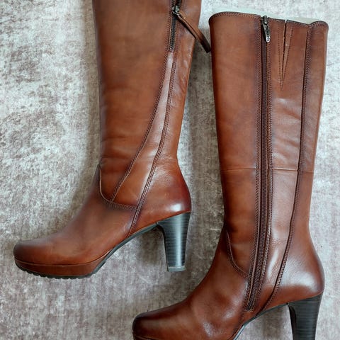Myydään uudet ja priimakuntoiset Tamariksen konjakinväriset nahkasaappaat koko 37. Kangasvuori, sisäsivussa vetoketju. Oikein kauniit saappaat. Ovh 154 e.
