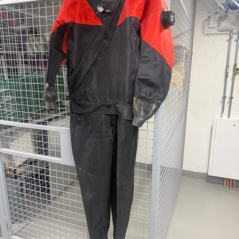 Käyttämätön kuivapuku viileneville syyskeleille. Vielä tehtaan paketissa. Ursuitilla teetetty sepalusvetoketju (ei näy kuvassa koska kuva Ursuitin materiaalista) helpottaa pikkuhädän yllättäessä.