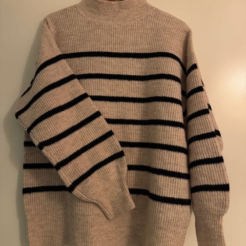 Trumpettihihainen monivärinen neule. Kokolapussa L, mutta sopii S-L kokoiselle.