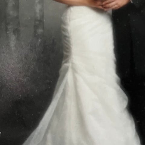 Paljon kehuja saanut suomalaisen Victoria & Vincentin koon 34-36 merenneitomallin hääpuku. Pituus muokattu 161cm+6-7cm korkokenkä. Takana laahus ja selästä avoin. Itse käytin ilman vannehametta, jolloin on rennompi.