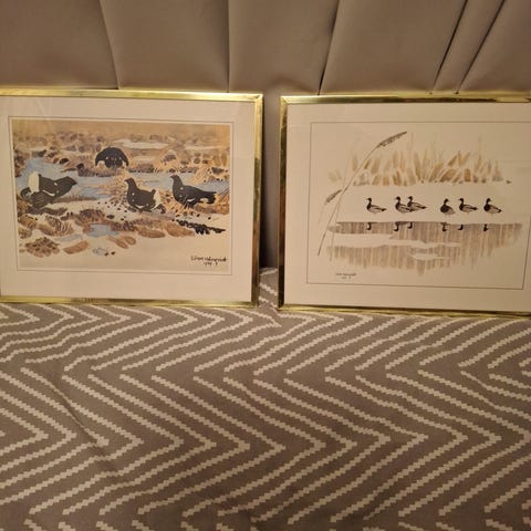 2 kpl lintuaiheisia tauluja koko n. 30x45 cm..