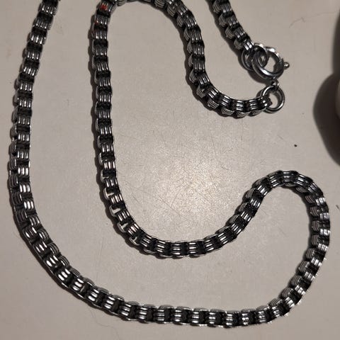 Vanha hopeanvärinen kaulaketju, pituus 41 cm. Leveys n 2 mm. Ehjä. Lukon vieressä olevassa pienessä lätkässä on numeroita, mutta niistä ei saa selvää. Voi olla hopeaakin. Postitus tai nouto.