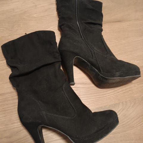 Pitkävartiset mustat saapikkaat. Pieni korko 5cm. Varren pituus nilkasta noin 40cm. Vasrmman jalan kengässä sauma takaa koron päältä hieman revennyt, saa ompelemalla kiinni.
