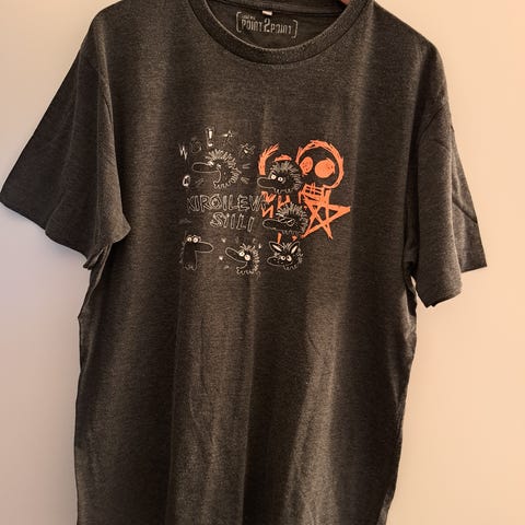 Noita-Kallio t-paita. Käsin seripainotekniikalla painettu paita, harmaata ja kultaista väriä mustalla Fruit of the Loomin Ringspun (Iconic 195 paidalla).