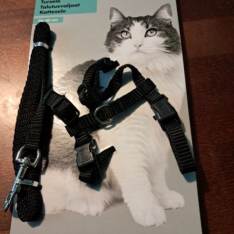 Vähän käytetyt pienen kissan valjaat ilman hihnaa.