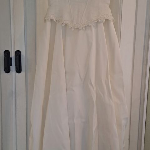 Olkaimeton pitsipuku + lisätty pitsihihat, muhkea A-helma, laahus nostettavissa lenkillä (nappikiinnitys takana). Väri: Ivory. Kiinnitys: nyöritys + vetoketju + napit. Pukupussi kaupanpäälle.