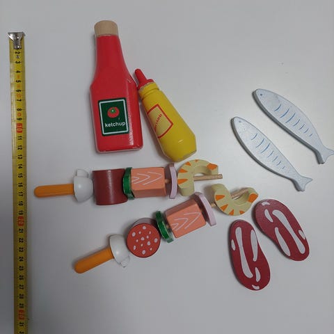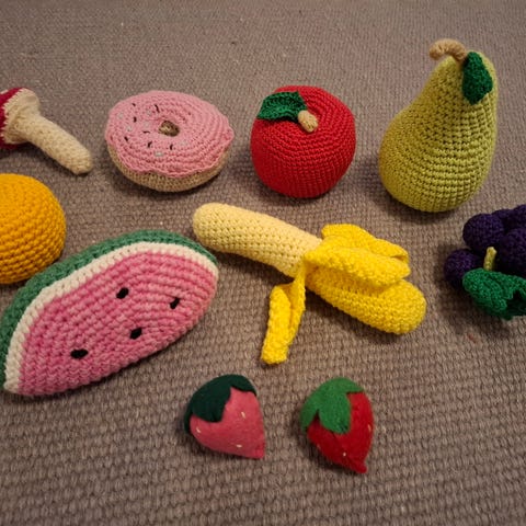 Virkattuja leikkiruokia. Lanka puuvillaa, voi pestä koneessa. Uusia!