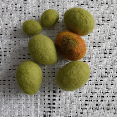 4 koristemunaa. Tehty kevyestä massasta ja maalattu. Koko n. 7x5 cm.