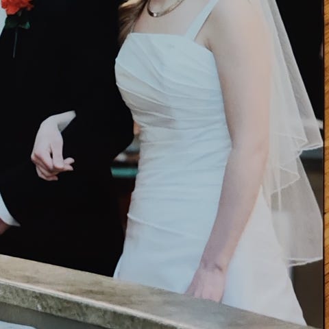 Valkoinen yksiolkaiminen hääpuku. Pitsikoristeinen sifonkikangas päällä. Sisäänommellut rintaliivit. Puku on pienennetty ompelijalla n. kokoon 34. Mukaan vannehame ja pukupussi. Puku ja vannehame pesty. Pukuun kuuluu erillinen helmikoristeinen satiinivyö. Puku on ollut n. 165cm morsiamella.