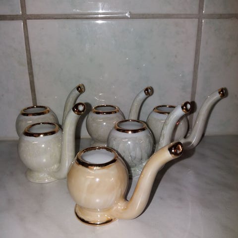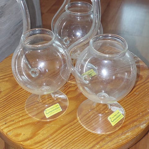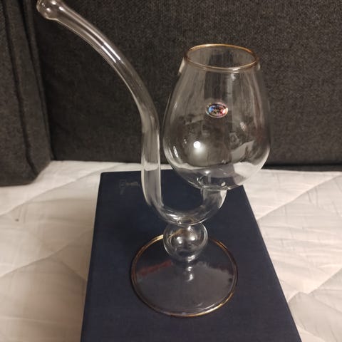 6kpl suomalaisen Lasi Kostamon valmistamia piippuja sekä puinen alusta (halkaisija 30cm).