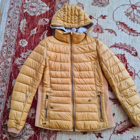 Conceptuc merkkinen vihertävän kullan- keltainen kevyttoppatakki. Kaunis naisellinen malli. Neppikiinnitys. Sivussa vetoketjulliset taskut. Hartialev. 42, ry. 106 cm. Kuin uusi.