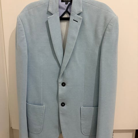 Miesten tummansininen bleiseri (kuvassa näyttää haaleammalta). 100 % villaa. Koko 52. Sijainti Pasilan postipuisto, Helsinki.