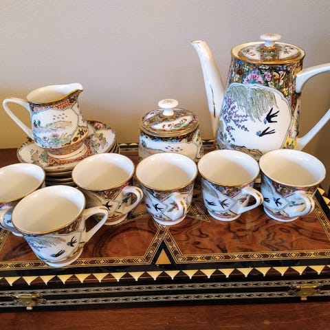 Kiinalainen posliiniteekuppi ja lautanen setti, sisältää kuusi kappaletta. Kupit ja lautaset ovat sinivalkoisia, valmistettu posliinista.