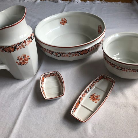 Arabian BP mallin vesikannu A3 ja vati 30-luvulta. Ehjät ja hienot, kannun siirtokuvassa pieni valm.virhe.