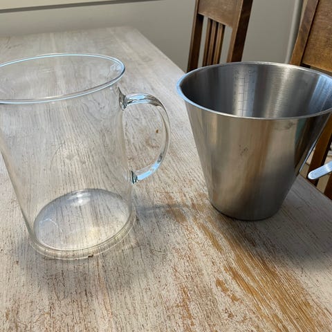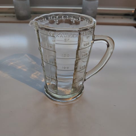 Valkoinen mittakannu, uusvanha, litran vetoisuus. Hinta 28€, noutaen.
