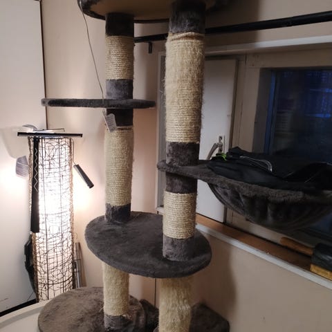 Kissanpeti, joka ei kelvannut meidän kissalle. Saa nostettua "piiloksi" mutta saa myös pistettyä kasaan kuten toisessa kuvassa näkyy. Mitat myös toisessa kuvassa.