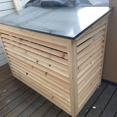 Mustaksi pulverimaalattu ja galvanoitu metallinen ilmalämpöpumpun ulkoyksikön suojakotelo. Saranoitu huoltoluukku sivuseinässä. Kiinnitystarvikkeet mukana. Sisämitta leveys 950mm, syvyys 460mm ja korkeus 700-850mm(etureuna-takareuna). Täysin käyttämätön, avaamattomassa pakkauksessa. Voin myös lähettää tuotteen.