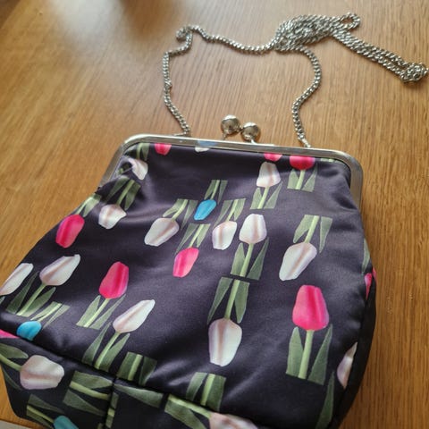 Musta valkokuvioinen Ivana Helsinki / Paola Suhonen pussukkalaukku. Hopeanvärinen metalliketju ja sulkumekanismi.