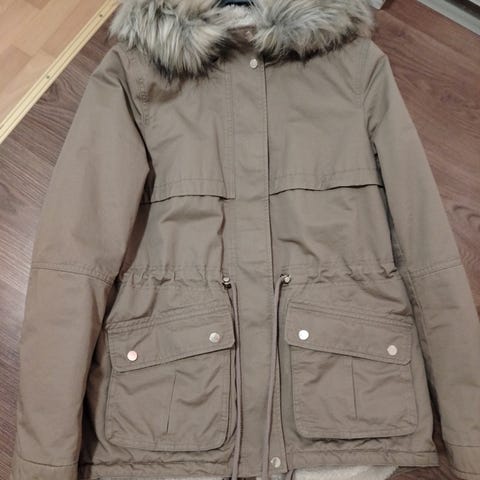 Myydään H&M divided talvitakki, koko 38. Takissa teddyvuori, mutta hihoissa liukas vuori. Hupussa irroitettava karvareunus.
